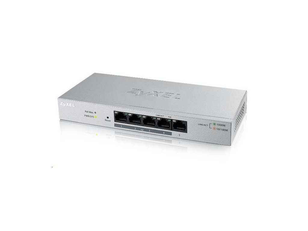 Zyxel GS1200-5HPv2 5-portový stolový gigabitový webový inteligentný PoE switch, 4x PoE+ GbE, PoE 60W, bez ventilátora